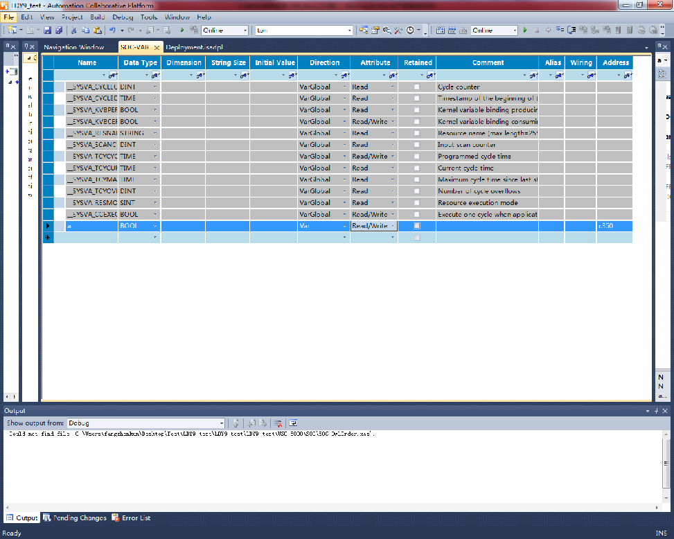 工程创建完毕后,点击“Solution Explorer”下的“Global Variables”,创建一个全局变量,创建该全局变量时,不需要设置变量地址。目前,USC-8000系统支持配置3种类型的全局变量,分别为BOOL型、INT型和REAL型。例如,设置的全局变量名称为a,数据类型为BOOL型,该变量可读/写,地址暂时为空。